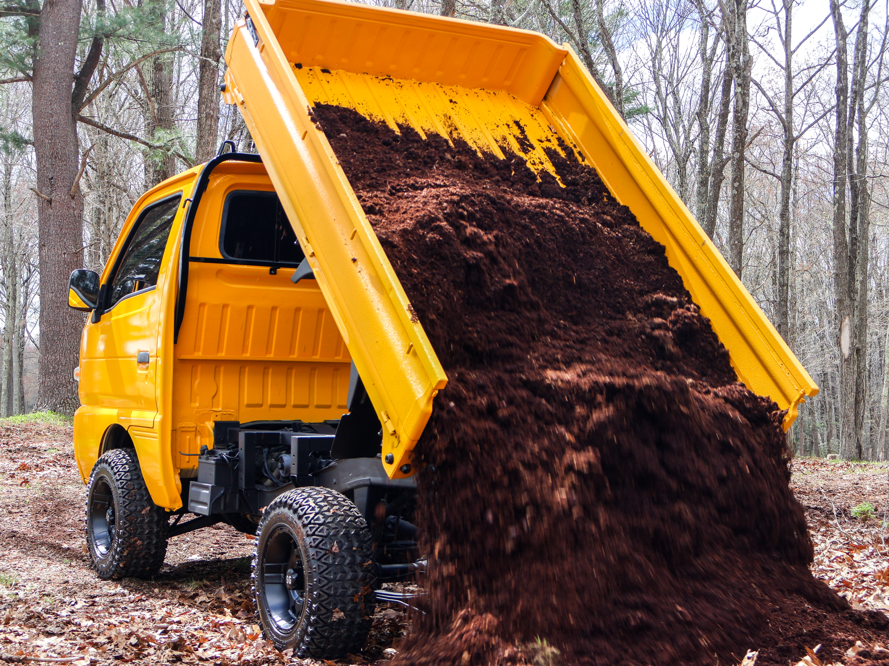 Factory dump bed configuration with functional hydraulic lift for real utility use.