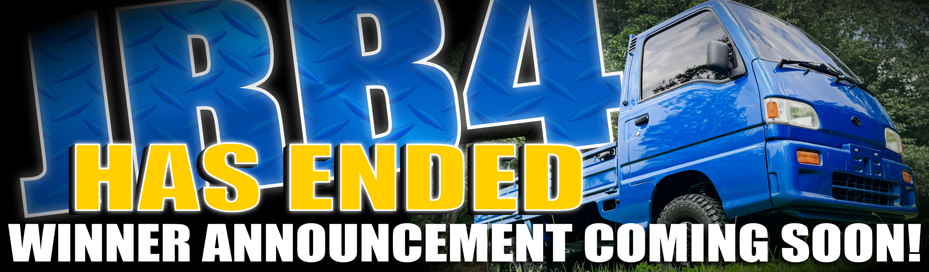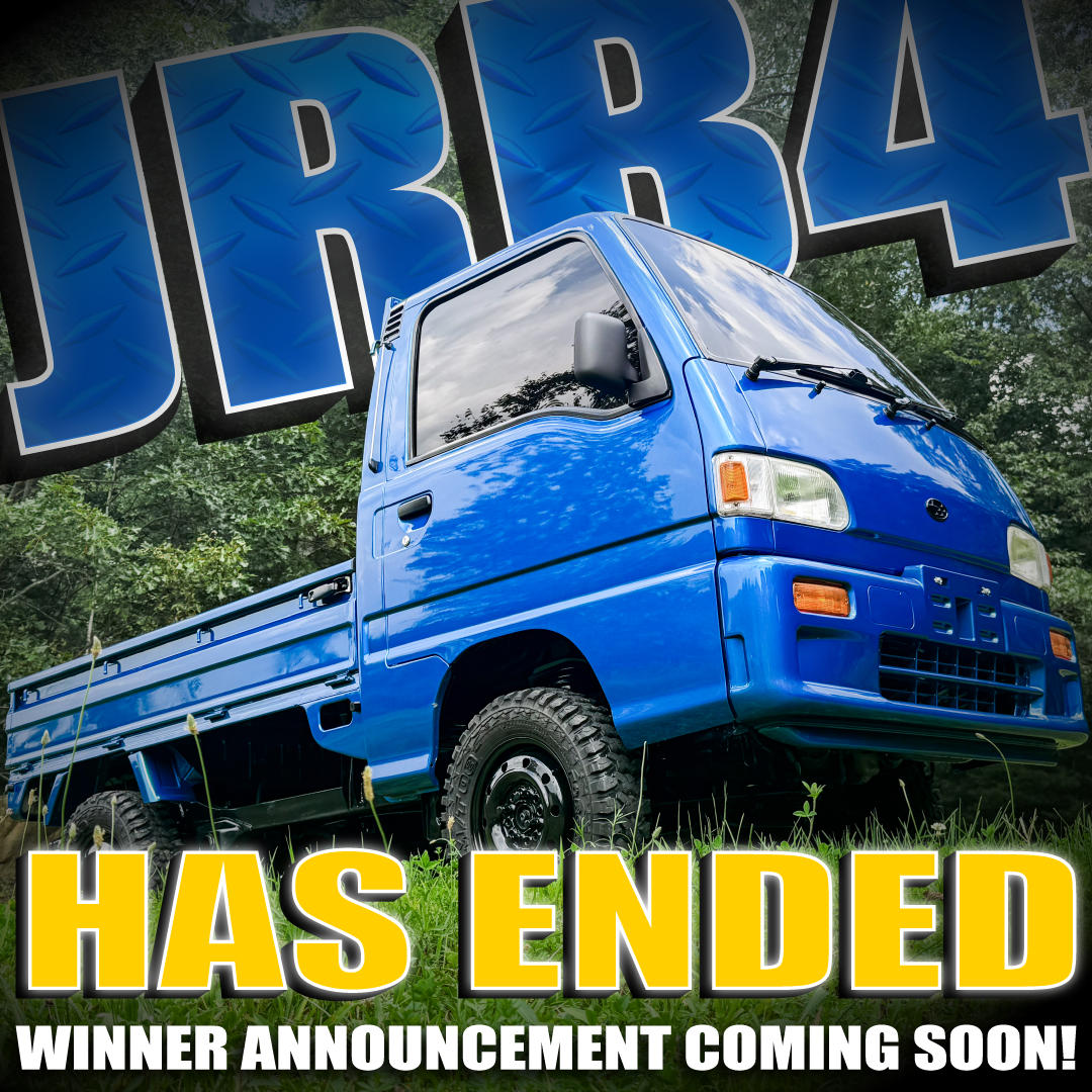 Blue mini truck on grass with promotional text overlay Blue restored mini truck with promotional text for a giveaway